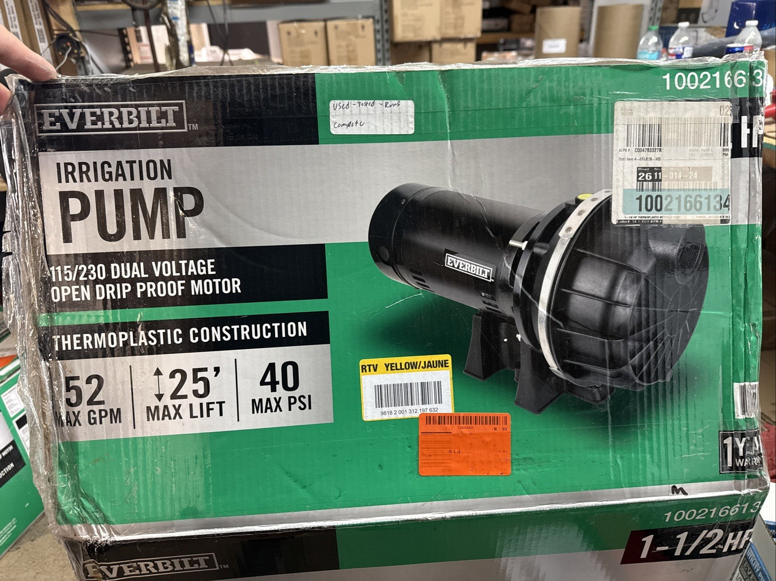 1.5 horsepower irrigation pump. The pump appears to be used, I hooked it up to power and it ran so I know the motor is not seized up. It’s probably a perfectly fine pump but I’m selling for parts only because I could not test with water.