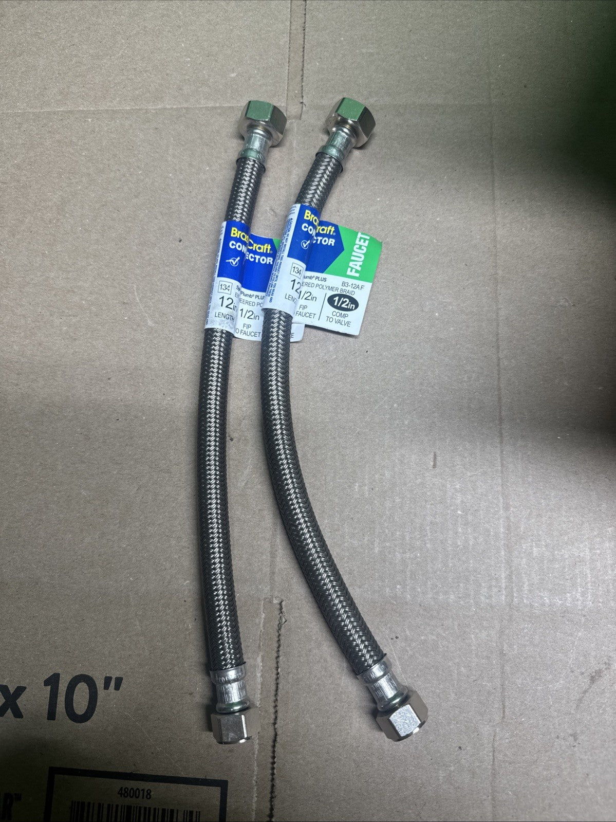 BrassCraft Speedi Plumb PLUS 1/2 in. Compression inlet x 1/2 in. Female Iron Pipe outlet x 12 in. length flexible braided polymer water connector is corrosion resistant inside and out. Used to connect the water supply to your faucet, this connector features a high tenacity, multi-filament yarn, protected by a special polymer coating for optimum corrosion resistance and durability. On the inside, our tough PVC tubing resists attack by chlorine, chloramines and other corrosive elements. The braided polymer fibers are designed to bend freely without kinking or crimping. Use to hookup cold or hot water supply.