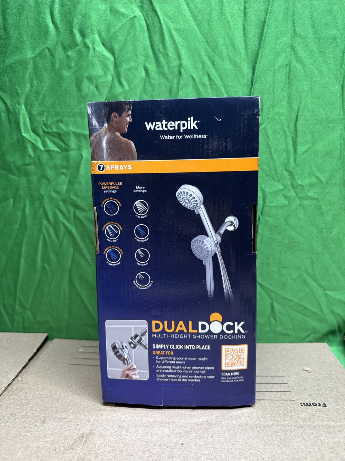 Customize your shower experience with two secure docking positions. Height adjusts 8 in. from low to high shower head positioning. Perfect for users of different heights or when shower pipes are too low or too high. In low position, the shower head easily and securely clicks into place on the docking base built into the included bracket. For high position, simply place the shower handle in the bracket. The DualDock hand held shower head provides a variety of shower experiences with 7-spray modes, including PowerPulse Therapeutic Massage. PowerPulse has up to 2X the massage force of other massaging shower heads and is clinically shown to help soothe muscle tension, increase flexibility, and promote restful sleep.